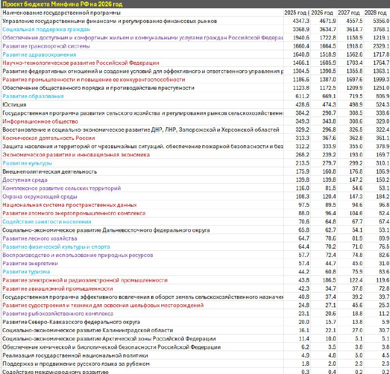 ▪️Если объединить все госпрограммы, связанные с наукой, технологиями и инновационной экономикой (выделены красным цветом), в 2025 году консолидированные расходы оцениваются в 3.87 трлн, тогда как в 2026 ожидается рост 4.38 трлн или существенный рост на 12.8% г/г по номиналу (в условиях попытки создать дезинфляционный проект бюджета).
